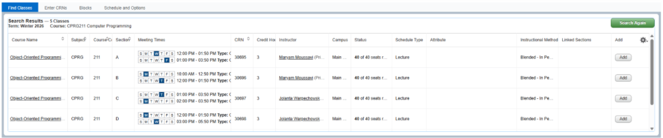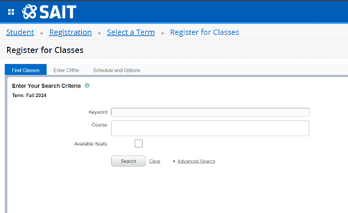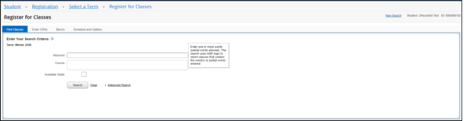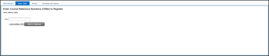 Once you have your mandatory block or if you are entering a semester after your first, select the Find Classes or Enter Course Reference Number (CRN) tab to search for your individual courses.