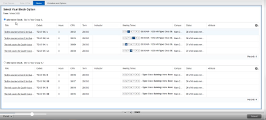 Select the radio button next to your chosen Alternate block of classes. Make sure there is a green registered icon next to all classes in the block - you will need to speak with your academic advisor if any one or more classes in the block are showing as full.