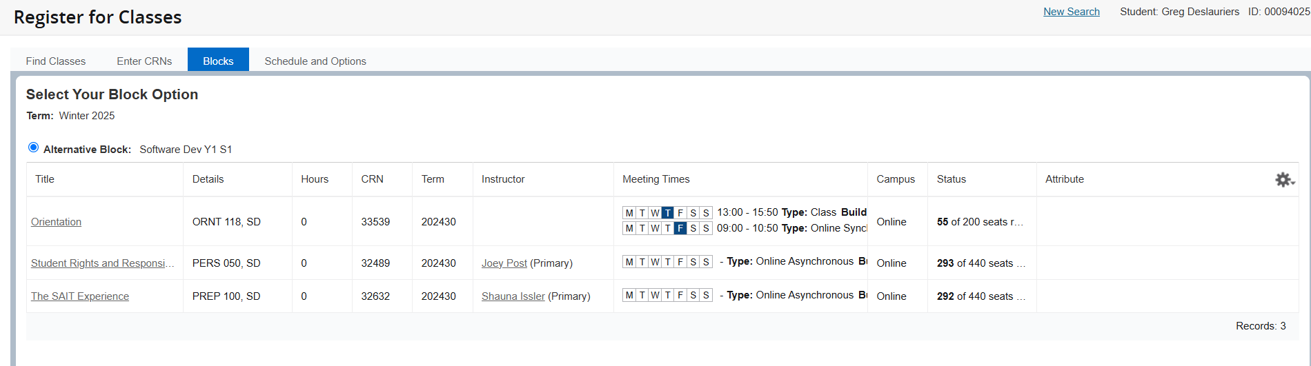 Select the Blocks tab if your program follows block registration rules or if you're in your first semester of an open registration program.