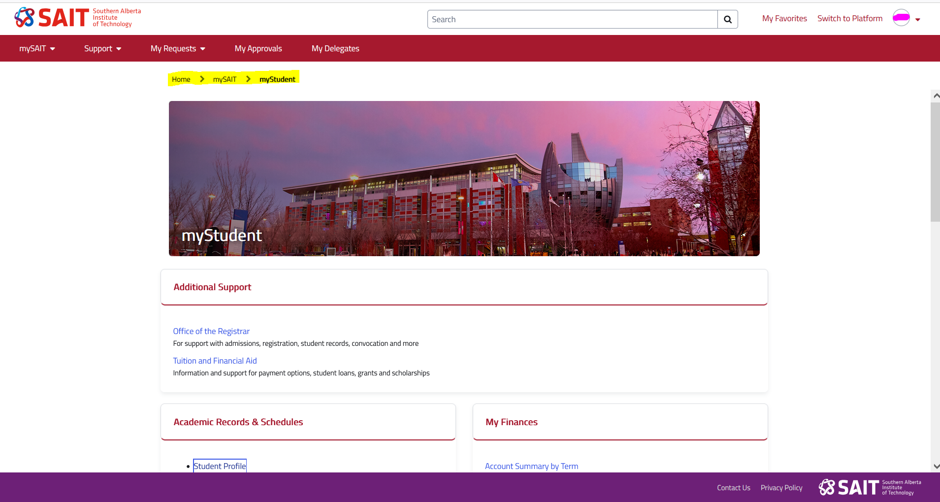Log into mySAIT and in the mySAIT tab select myStudent from the dropdown menu.