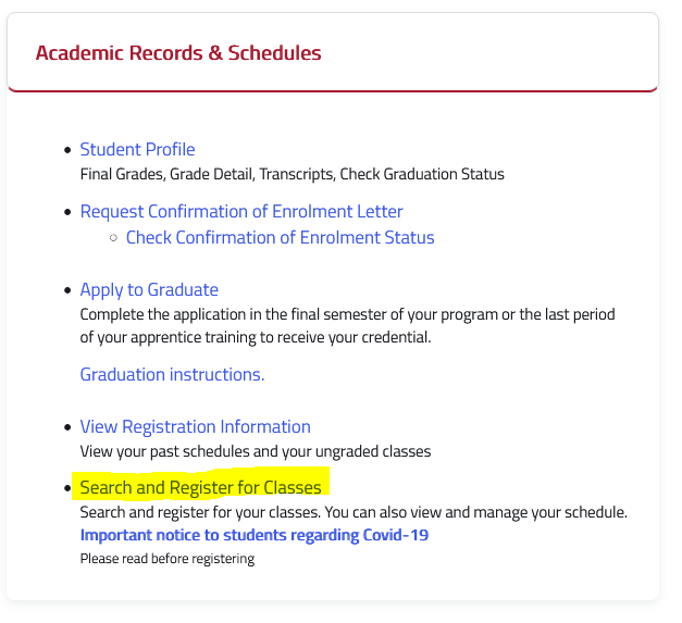 The way you register depends on whether your individual program follows open or block registration rules. You can find which registration type your program falls under in Getting your Class Schedule page. Here are the steps for each registration type.
