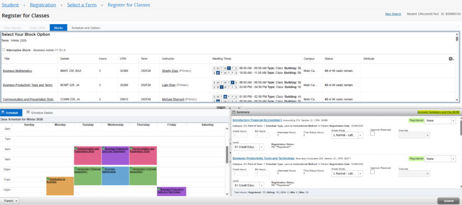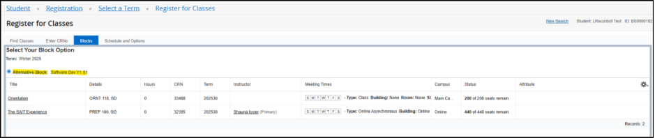 First semester students in open registration programs will start by selecting the Blocks tab and choosing your block of mandatory orientation and prep courses. Select the radio button next to your orientation block then click the “Submit” button on the bottom right. Review next steps for new students to learn more about these important Prep courses.
