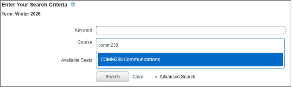 You can type in the course name in the keyword section, type in the course code in the course section, or enter the CRN number to search.