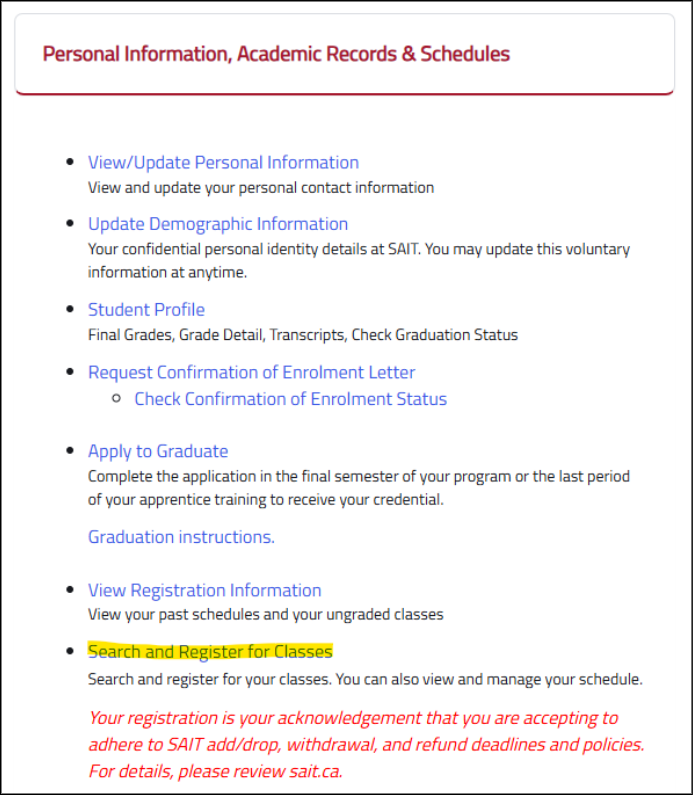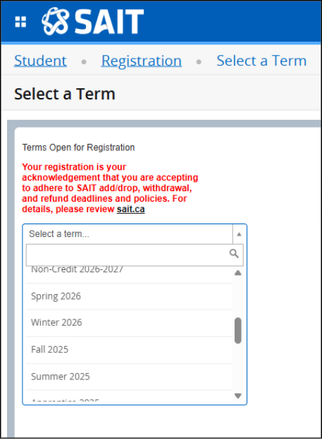 Your registration is acknowledgement that you will adhere to SAIT add/drop, withdrawal and refund deadlines and policies. Be sure to check important dates and deadlines. Students who withdraw after the start of the semester are not eligible for a full refund. No refund will be provided after the add/drop deadline.