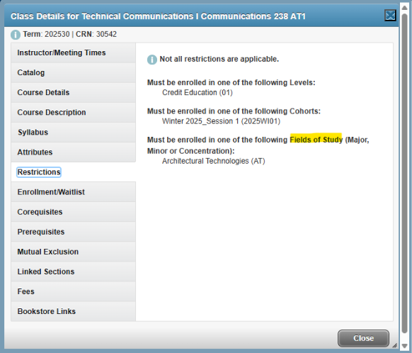 For some courses, there might be multiple sections to choose from. Click on the course name and then select Restrictions. You can only select the fields of study related to your program. Otherwise, a field of study restriction error will occur.
