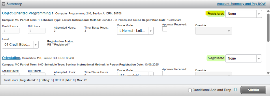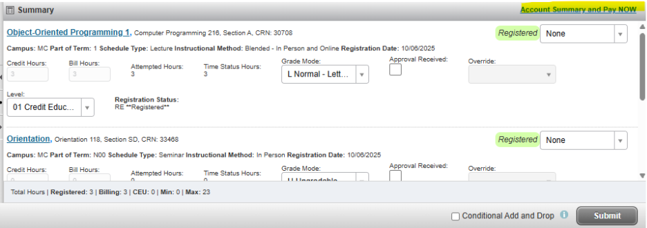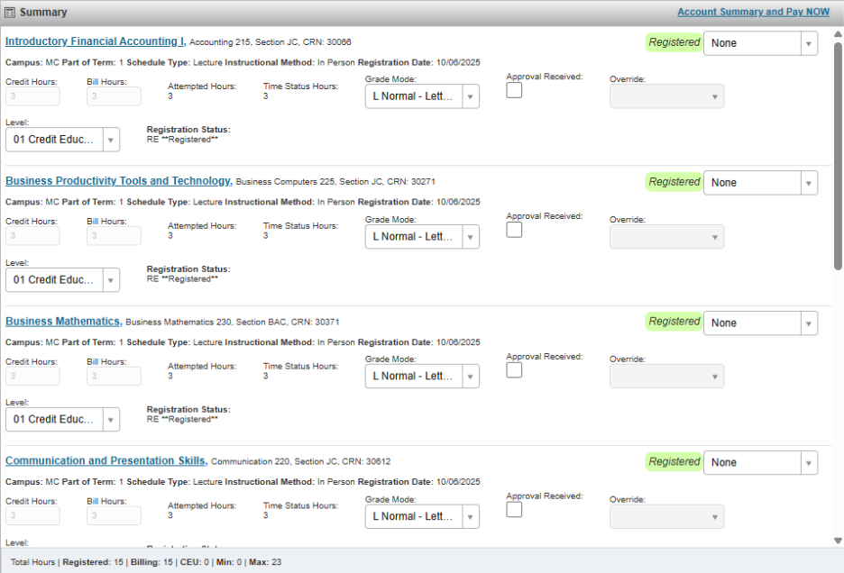 Once you have chosen all classes, select Account Summary and Pay NOW to apply the tuition and fees to your student profile.