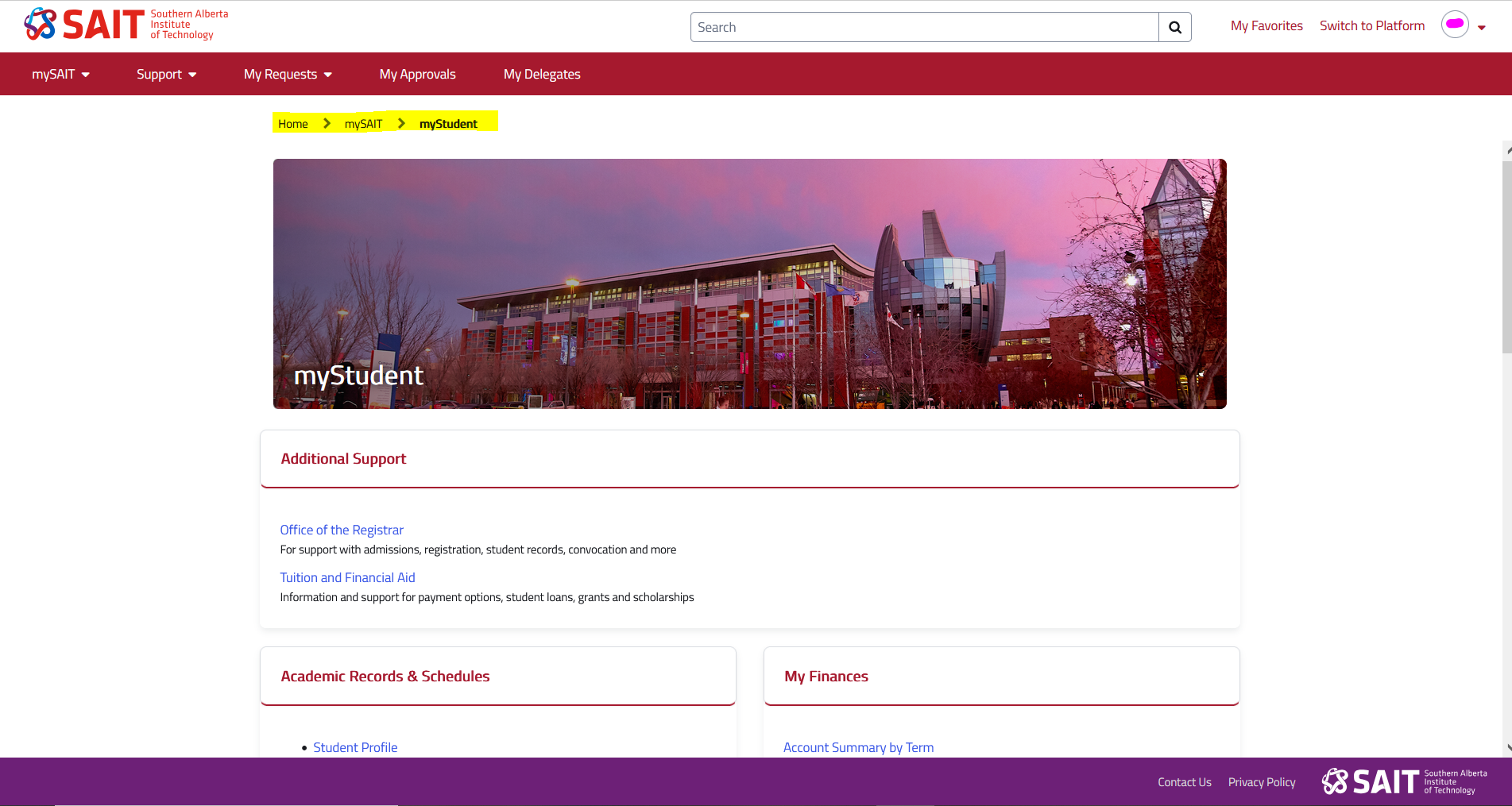 - Log in to mySAIT and in the mySAIT tab select myStudent from the dropdown menu.